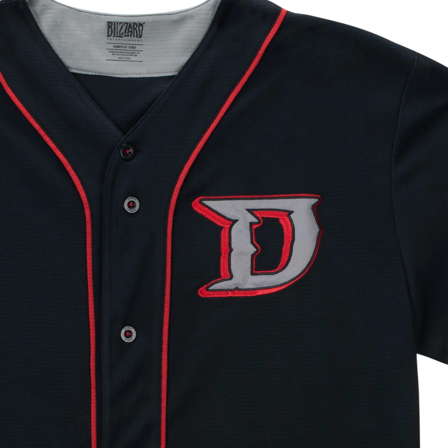The Diablo IV Black Baseball Jersey is a one of a kind addition to any fan's wardrobe. Made of 100% Polyester, this jersey has front and back embroidered embellishments, unique Diablo buttons, a Diablo IV hip logo, and embroidered sleeve detailing.
